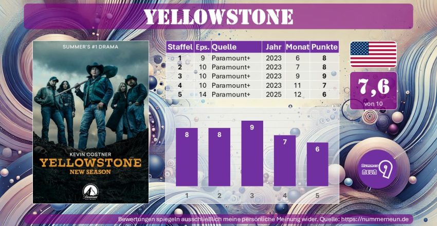 Fast aus dem Nichts heraus ist Yellowstone ein weltweit großes Phänomen geworden. Epische Bilder, große Namen, archaische Konflikte, der Mensch gegen die und mit der Natur, Familiendynamiken und hart arbeitende Menschen waren die Grundlage der von Taylor Sheridan entwickelten Serie. Sie hat mit 1883 (9/10) und 1923 (Staffel 2: 5/10) bereits zwei ergänzende Serien mit sich gebracht, weitere sollen folgen. In leicht abgewandelter Form hat Sheridan die gleiche Formel für Landman (7/10) noch einmal benutzt. Mit der 5. Staffel bringt er nun der Ursprung des ganzen Hypes zu einem Ende. Notgedrungen, denn der große Name der Serie vor der Kamera stieg aus: Kevin Costner, der Familienpatriarch der Duttons, verabschiedete sich im Laufe der Staffel.