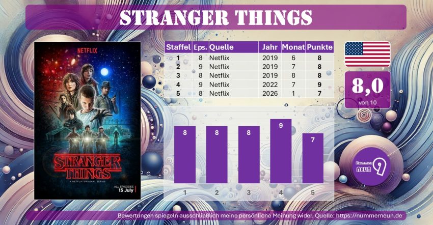 Stranger Things ist eine der Serien, die Netflix groß gemacht haben. Das ganz große Kino aus Staffel 4 (9/10) ist mittlerweile jedoch auch schon wieder über drei Jahre her und der Hype hat seitdem spürbar abgenommen. Trotzdem war allgemein die Vorfreude und die Erwartungen an die finale Staffel riesengroß. Diese Blase konnte doch nur platzen, oder?