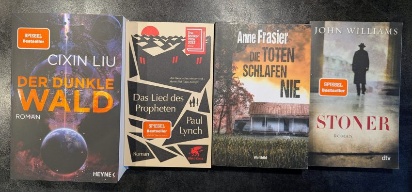 Wenn ich mit den Brüdern erst einmal durch bin, dann könnte ich mich an meinen sogenannten SuB wenden, dem Stapel der ungelesen Bücher. Diese haben die erste Hürde bereits überwunden, denn sie befinden sich bereits in meinem Besitz. Im SuB liegt mit dem Science-Fiction Roman Der dunkle Wald von Cixin Liu der zweite Teil der Trisolaris-Reihe bereit. Hoffentlich schaffe ich ihn zu lesen, bevor Netflix die zweite Staffel der Serienverfilmung veröffentlicht. Allerdings ist das ein weiterer dicker Türstopper. Kürzer ist dagegen Stoner von John Williams, der bereits meinen Roman des Jahres 2023 geschrieben hatte. Außerdem liegt auf dem SuB noch der dsytopische Roman Das Lied des Propheten des irischen Schriftstellers Paul Lynch. Auf dem Kindle steht von Brandon Q. Morris mit Die erste Kosmonautin eine weitere Fortsetzung bereit. Und schließlich habe ich von Anne Frasier den Thriller Die Toten schlafen nie hier, gerettet aus dem öffentlichen Bücherschrank. Alleine mit diesen Büchern wäre also schon die Hälfte meines Leseziels für dieses Jahr erfüllt.