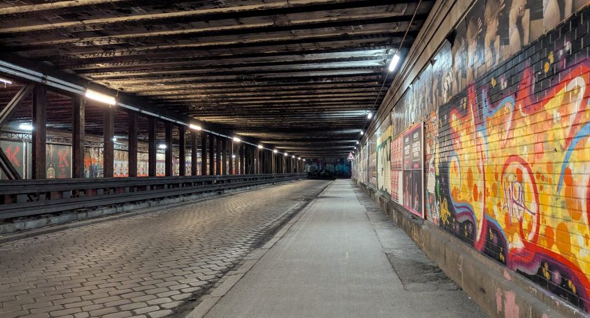 Heute mal ein etwas anderes Bild aus München. Entstanden ist es beim nächtlichen Wechsel zwischen zwei Locations am vergangenen Wochenende. Wir sehen die Tumblingerstraße, die hier unter den Bahngleisen entlang führt. Am Ende des Tunnels folgt auf der rechten Seite der Eingang zum Bahnwärter Thiel (was jedoch nicht das Ziel der Nacht war).