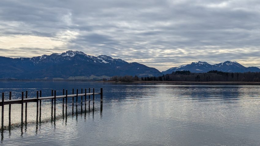 Ich war für knapp anderthalb Tage am Chiemsee und hatte so halbwegs Glück mit dem Wetter. Bei bestem Sonnenschein habe ich von Priem aus die Fähre zur Fraueninsel genommen und sie dort einmal in Ruhe umlaufen, während sich der Himmel langsam zu zog. Dabei ist auch das Foto entstanden. Der Blick auf den See mit einem Steg als Motiv – das ist so mein Standardfoto bei solchen Ausflügen.