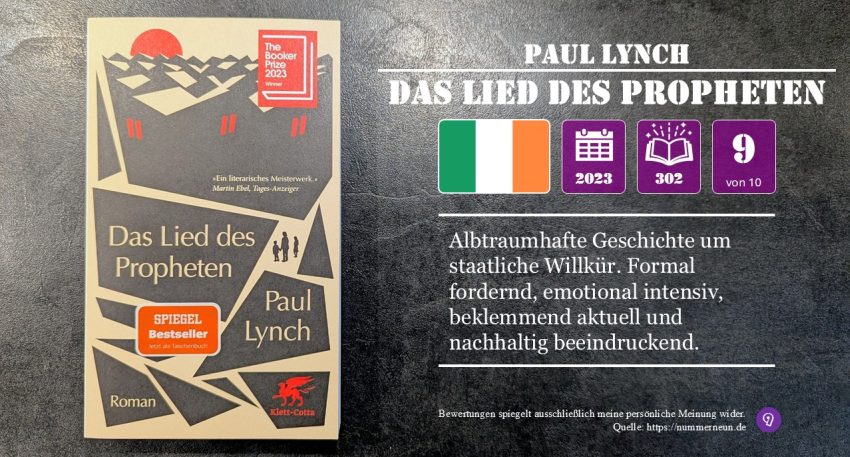 Review: Wow – was für ein Roman! Eine Geschichte aus einem Alptraum, aus dem es kein Entrinnen zu geben scheint. Eilish und ihre Familie geraten immer tiefer in den Abgrund, werden schuldlos in den Schlund der Hölle hinein gezogen, ohne es in irgendeiner Form befeuert zu haben. Wenn der Staat keine Grenzen mehr zu kennen scheint und die Gegenbewegung mehr Krieg spielen möchte als zu helfen, was kann sie dagegen tun? Die Erzählung ist sehr nah dran an Eilish, durch ihre Augen sieht man, wie das Grauen langsam in den Alltag einsickert. Was sie lange vor sich selbst leugnet, wird immer mehr zur Gewissheit. Man wagt kaum weiterzulesen, welches Schicksal noch auf sie und ihre Familie einstürzen wird. Interessanterweise hat Autor Paul Lynch laut eigenen Aussagen mit dieser Geschichte nicht versucht, die Auswüchse von aktuellen Systemen mit totalitärem Anspruch in die Zukunft zu projezieren, sondern hat tatsächliche Ereignisse aus Ländern wie Syrien fiktiv bearbeitet und nach Irland verlegt um zu zeigen: Es passiert jetzt alles schon, das ist die Realität vieler Geflüchteter. Auch für den Lesenden ist das Buch eine Herausforderung. Lange Sätze ohne Absatz, Dialoge versteckt im Fließtext – entweder man schwimmt mit im Lesefluß, oder man geht unter. Das wäre schade, denn es lohnt sich. Es ist ein nachhallendes Leseerlebnis.